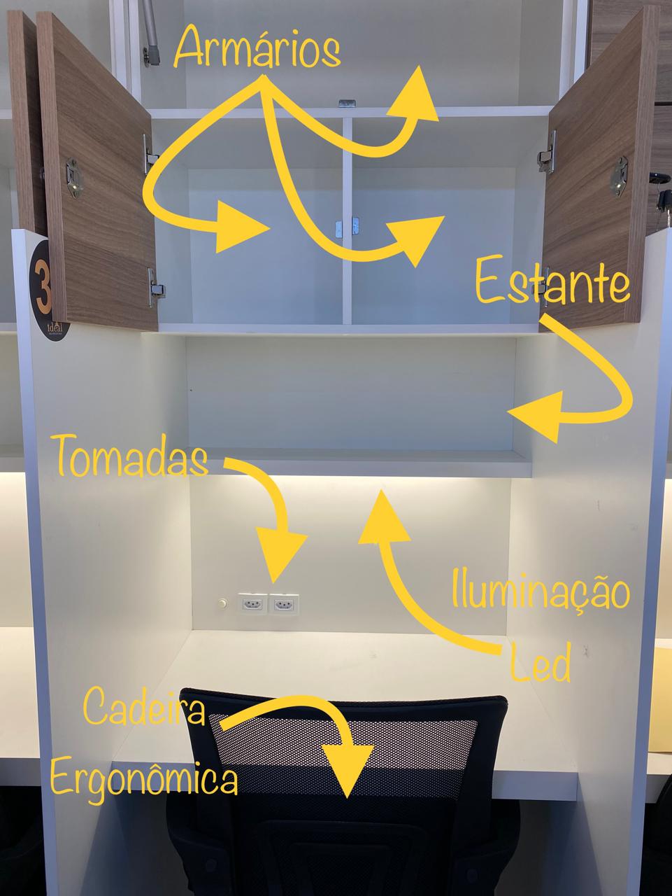 Cada cabine é projetada para proporcionar conforto total, com cadeiras ergonômicas, boa iluminação e tomadas acessíveis. Trabalhe com a privacidade e o conforto que você merece!