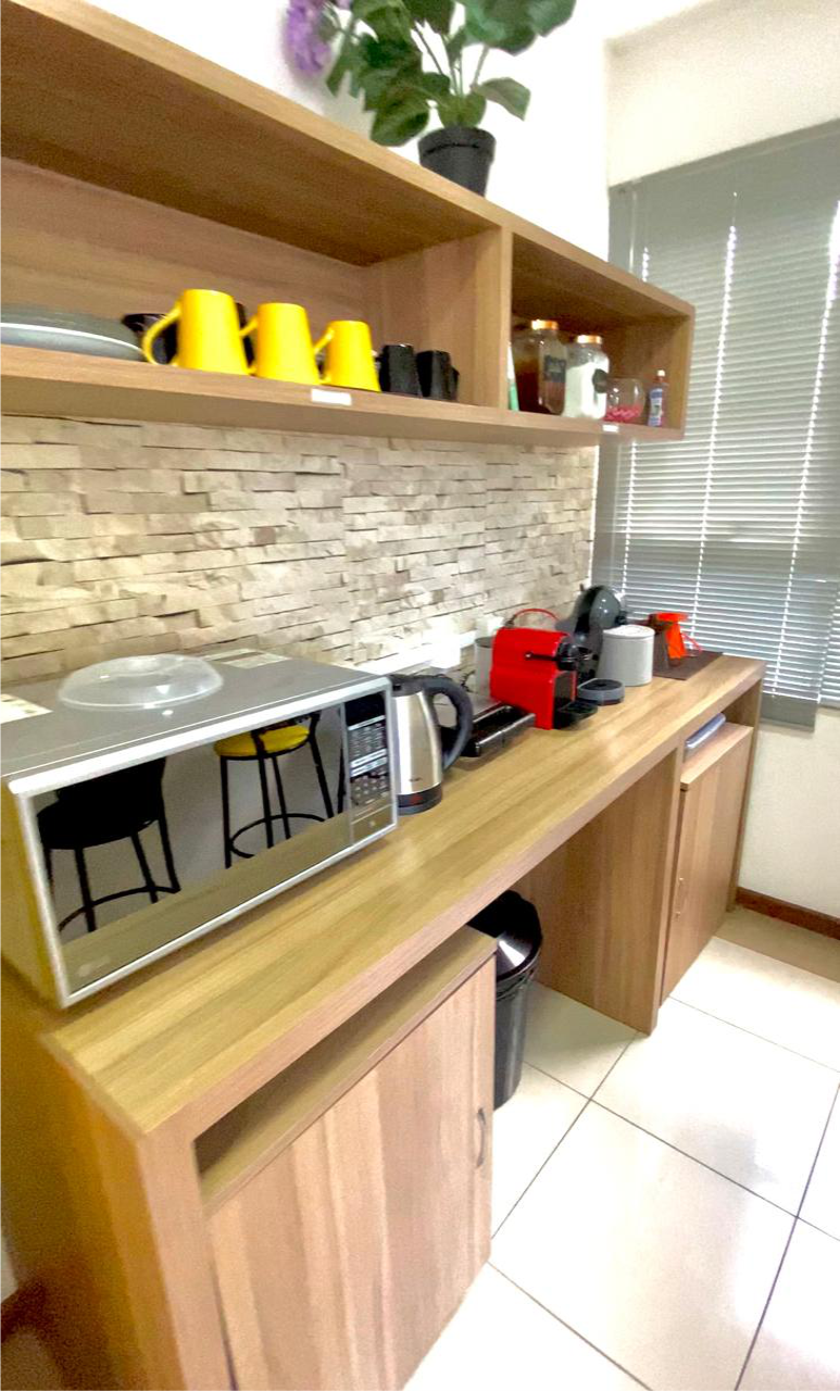 Nossa copa é equipada com tudo que você precisa para um intervalo perfeito: geladeira, micro-ondas, cafeteira e muito mais. Café fresquinho sempre disponível para você!